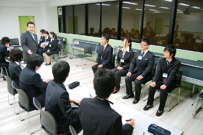 現在の企業を取り巻く環境や、求められる人材像を理解することから始まり、就職活動の土台となる職業観を確立させます。同時に業界研究、受験対策などの就職活動に必要な各種スキルの指導も行います。