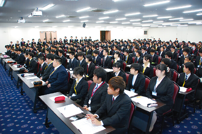 就職活動の直前に行う1泊2日の合宿。グループ演習や模擬面接、マナートレーニングなど就職活動の準備を2日間にわたって徹底指導します。学生・教職員だけでなく、卒業生まで来場。総勢300名以上が一堂に会します。