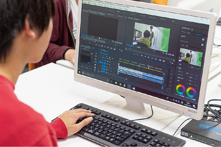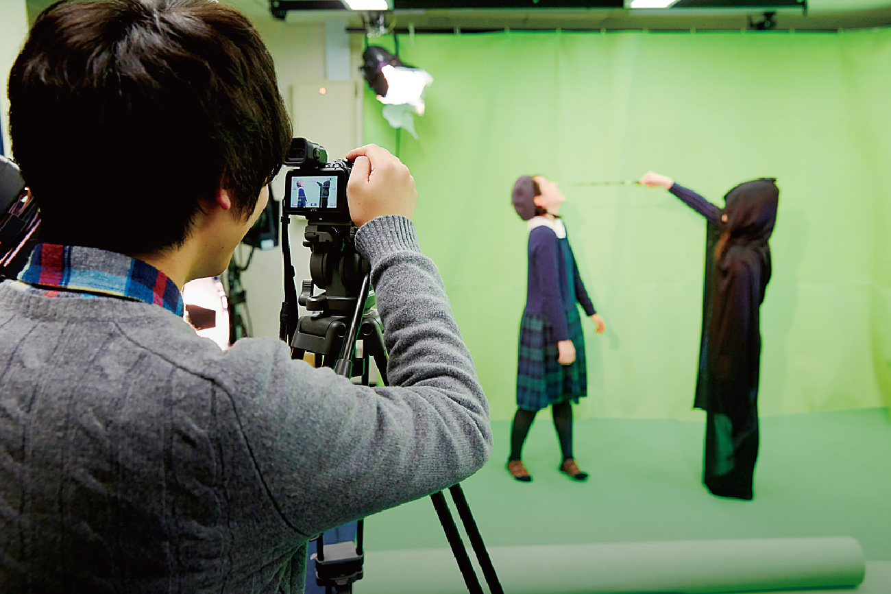 実習施設は高度化するCG映像業界に対応したハイスペックな環境。クロマキースタジオでの撮影、コンポジット(合成)など