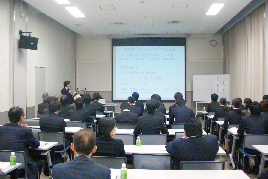 KEIS(関西電子情報産業協同組合)を通じて、その加盟企業のインターンシップに参加できるプログラム。実施後のフォローアップ交流会では、学生と企業の担当者が集合して発表会とグループディスカッションを行います。
