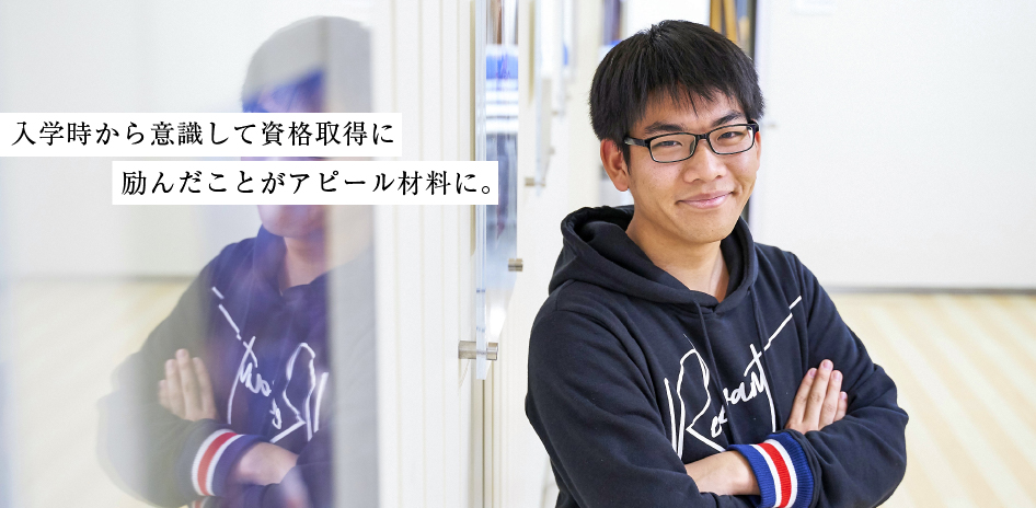 入学の段階から資格取得を意識して学んできました。1年の6月には日商簿記検定3級を取得し、2月には自分の力を試そうと日商簿記検定2級を受検し、無事に合格。ほかにもMOS検定、秘書技能検定試験3級も取ることができました。いずれの資格もカリキュラムに対策授業が組まれていますので、それを着実に学んでいくことと、MOSに関しては夏休みの対策講座にも出席して勉強していました。資格は就活のアピール材料にもなりました。先生と履歴書をブラッシュアップしているとき、僕のよい点は資格を取得したことに加えて、そのための行動を早めに起こせたことだとアドバイスしていただき、自分から行動できるという文を履歴書に盛り込みました。授業で印象に残っているのはビジネスマナーです。挨拶の仕方、メールや電話対応など、職場での振る舞いをイメージできたし、会社で直接役立つ知識なので興味深く学んでいました。