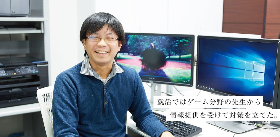 本来アニメーション分野での就職をめざしていたのですが、ゲーム会社も念頭にはありました。先生の勧めでViViViT(ビビビット)という就活サイトに作品をアップしたところ、カプコンさんからお声掛けいただいたので、めざしてみることに。ViViViTには、自分なりにクオリティーの高いと思えるエフェクト作品を選ぶとともに、リアル、アニメ調など幅広い作品をアップしました。サイト上で作品の評価は終わっているので作品選考は免除の扱いですが、僕は面接で話題にしたかったのでポートフォリオを持参しました。質問されたのは作品づくりで何を心掛けているか。一つのエフェクトだけではなく、複数のエフェクトを組み合わせて細部を仕上げるなど、ディテールにこだわっているとお答えしました。さらに入社後のビジョンを尋ねられた際には、エフェクトチームのリーダーをめざしますと回答しました。カプコン対策としては、先生がゲーム系の先生を紹介してくださり、カプコンに入社したゲーム系の先輩たちの就活履歴を参考にしました。先生から面接の傾向を教えてもらっていたので答えを準備していたのですが、それが的確にハマりました。