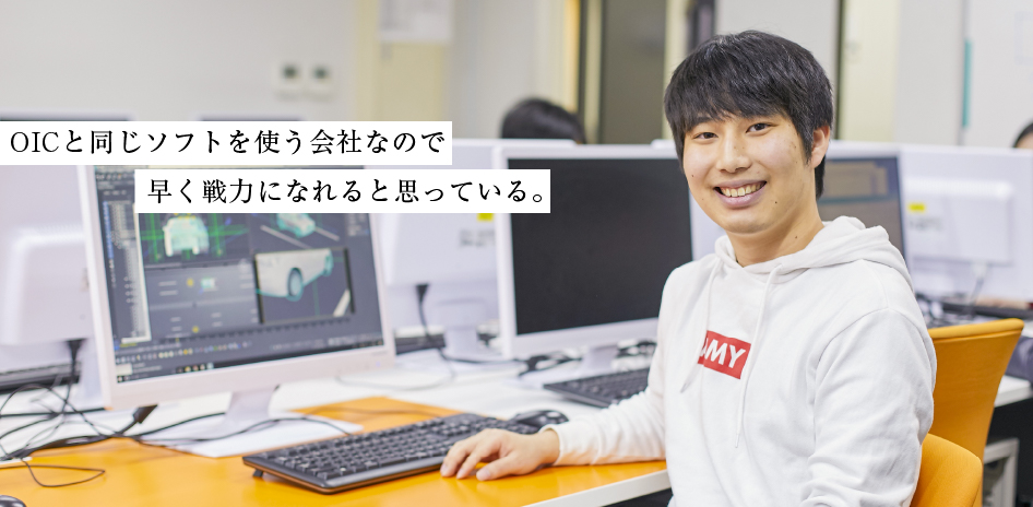 学校求人を見て興味を持ち、会社見学に行かせていただきました。事業内容の説明を受けたほか、使用ソフトについて確認するとOICと同じ3dsMaxだったので、学んできたことが活かせる会社だと思いました。幅広い事業を展開しているのも魅力で、3DCGを用いて仮想空間を自由に動けるバーチャルシミュレーションという自分の知らない分野も手がけています。この会社ならこのような新しい分野も勉強できると思いました。内定後はインターンシップに参加しています。インターンで仕事を覚え、できるだけ即戦力として入社したいと思っています。また、内定先にはOICのクラスメイトと一緒に入社できることになりました。心強い同期とともに協力して仕事に励みます。