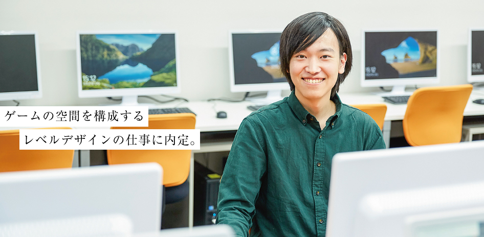 内定先はアクションゲームに強いのですが、それ以外にも様々なジャンルを開発しています。映像のリアルさも特色で、とくに海外向けの作品は非常に個性的な映像を追求していると感じます。僕はアクションにもリアルにも興味があり、自分がかかわりたいタイプのゲームが多いので興味を持っていました。職種はゲームデザイナーで、内定先ではプランナーを意味します。相手は世界。「日本のレベルデザインならヤマネだ」といわれるくらいの存在になることをめざします。