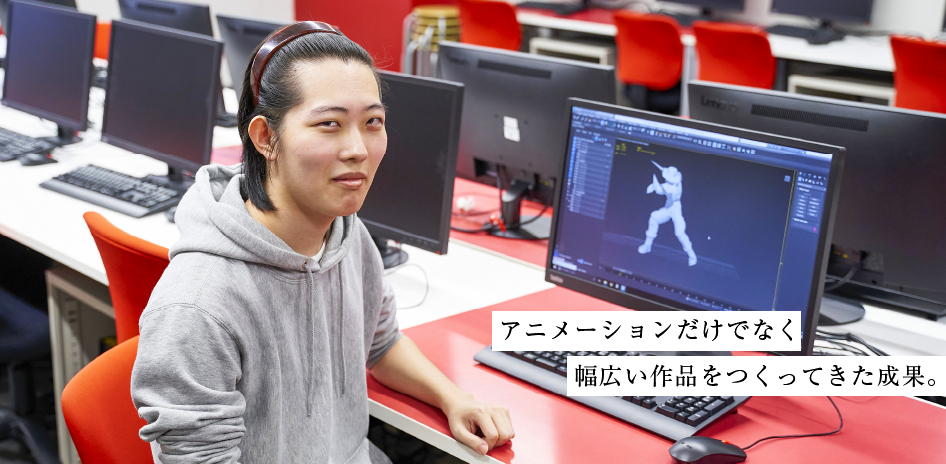 モーションデザイナーという仕事を知ったのは、OICのオープンキャンパスです。業界のなかでも華のある仕事なのに、まだ人が少ない。キャラクターを自由に動かすことができる。そうした説明を聞いて、めざしてみたいと思いました。実際に勉強は楽しく、かっこいい動きだけなく、怒り、喜びなど多様な感情表現ができるようになっていきました。顔の表情に加え、体の動きやちょっとしたしぐさの一つひとつで微妙な気持ちを表せることがわかると、どんどん深みにハマっていきました。技術面で非常に重要だったと思う授業が、実はデッサンです。デッサンを通じて空間の把握力、観察力、思考力などが身につきました。対象を正しく観察して描くのはもちろん、目に見えない反射光をどう描写するかなど、考えることの大切を学びました。モーションをつくるときはリファレンス動画を撮ってそれを絵コンテに移すのですが、その際どの部分を強調して描くべきか。その判断ができるようになりました。