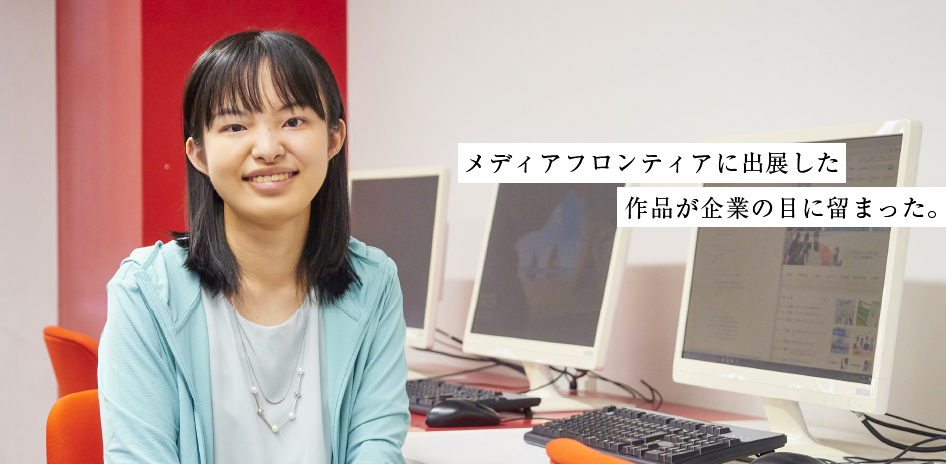 メディアフロンティア(学生作品展)で私の作品に関心を向けてくださったのが内定先です。発想がいいということで、先生を通じて入社のお誘いをいただきました。メディアフロンティアでは何とか企業の方の目に留まるよう、就活の意識を持って出展したので、いい結果になりました。それでも一般的な就活も行い、並行して内定先も受ける形をとりました。内定先の選考過程は、まず個人用の会社説明会を開いてくださり、その後筆記や面接など。キャリアブートキャンプ(就職対策の合宿)でしっかりと面接練習をしていたので、その成果を発揮することができました。内定先には入社前にアルバイトに行く予定です。新規プロジェクトを進めるので、その仕事に入ってほしいと言われています。早く戦力になれるよう、アルバイトでしっかり勉強させていただきます。