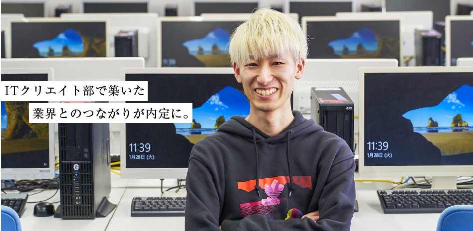 1年生のとき、ITクリエイト部の活動でScala(スカラ)というプログラミング言語に関するカンファレンスに、ボランティアスタッフとして参加しました。内定先がそのスポンサー企業になっていたことが、会社を知ったきっかけです。ちなみにScalaとは、Javaをシンプルにすることを主要コンセプトにした言語で、書籍やサイトを通じて独学で学びました。内定先はこの言語の学修経験がないと入れないので、部活を契機にScalaを勉強したことが内定の要因にもなっています。内定先はITクリエイト部の活動においても、何かとひいきにしていただいています。4年生のとき内定先を含めた企業さんを招いてプレゼンをする機会があり、そこで僕のプレゼンを評価してくださり、面接のお誘いを受けたという流れです。最終面接は大変緊張してしまったのですが、無事に内定。理由は「伸び代がある」ということだったとお聞きしました。伸び代については自分ではわかりませんが、業界のカンファレンスなどで内定先のエンジニアの方と顔を合わせる機会も多々あり、学ぶ姿勢も評価されたのではないかと思っています。