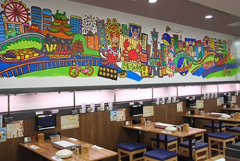 大阪・心斎橋の周防通(ヨーロッパ通り)に新しくオープンした、「串かつ だるま 心斎橋店」の店内壁画を本校デザイン分野の学生が制作いたしました。