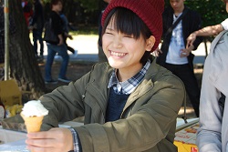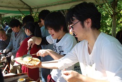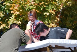 ステージイベントではブレイクダンス、コスプレダンスの披露や、腕相撲大会、アコースティックギターの弾き語り、ビンゴ大会が行われました。その中でも特 に盛り上がったのが男子腕相撲大会。昨年の腕相撲優勝者を倒そうと、参加者は列をつくりました。しかし、昨年優勝者が圧倒的な強さで見事、二連覇を達成し ました。