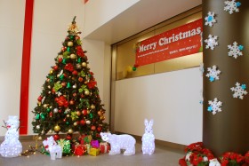 OICでも、そんな楽しいクリスマスムードを盛り上げるべくエントランス周辺を華やかに装飾しています。