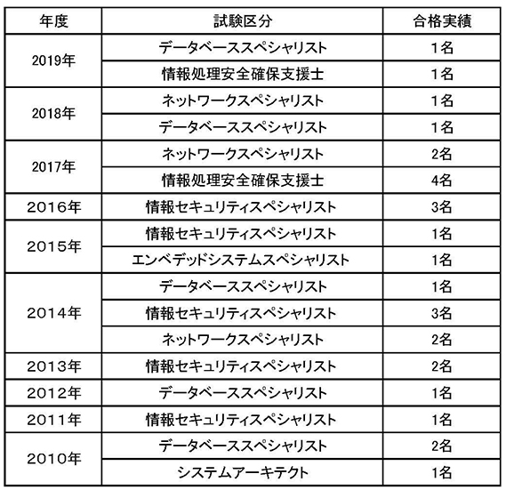 データベーススペシャリストに1名、情報処理安全確保支援士に1名の学生が合格しました。