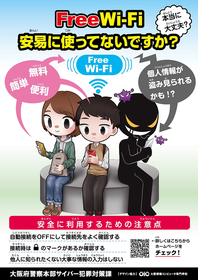 大阪府警察本部サイバー犯罪対策課が年末年始のインターネット利用に注意を呼び掛けるポスター作成を企画し、本校の学生が協力して「Free Wi-Fi」を題材にサイバー犯罪被害防止のための広報啓発ポスターを制作いたしました。制作したポスターは大阪府内の全小学校に配布され、大阪府警察本部サイバー犯罪対策課のWebサイトにおいても公開されております